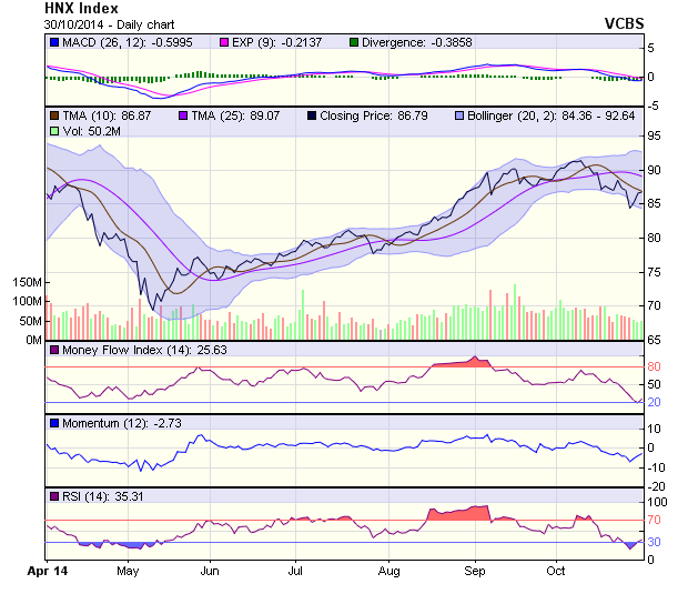 Trái ngược với VN-Index, HNX-Index trong phiên 30/10 tăng điểm nhẹ lên 86,79, đường giá đang tiến sát đến MA(14) và MA(20) tuy nhiên cần một sự bứt phá mạnh mẽ qua hai đường này để tiếp tục duy trì xu thế hồi phục.
