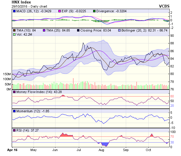 Các chỉ báo kỹ thuật được cải thiện trong phiên 28/10, nhưng vẫn chưa thể đảm bảo một nhịp tăng điểm dài hơi. Điểm tích cực là VN-Index vẫn đang vận động trên đường EMA 45 trong trung hạn. MFI, RSI đang hồi phục nhanh, Chaikin oscillator, ADX sắp cho tín hiệu mua trở lại dù MACD vẫn duy trì phân kỳ âm.