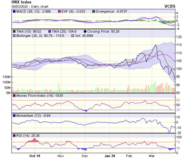 HNX-Index tiếp tục đi xuống thủng ngưỡng đáy 95 điểm của tháng 7/2018 và duy trì đóng cửa dưới hầu hết các đường MA quan trọng từ MA5 tới MA200, cho thấy xu hướng giảm đang mạnh lên, chỉ số có thể suy giảm về vùng tâm lý 90 điểm trong những phiên tới.