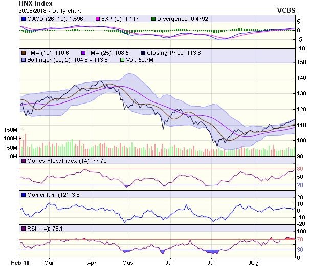 HNX-Index có diễn biến tương tự. Chỉ số có phiên tăng điểm thứ sáu liên tiếp và duy trì đóng cửa trên các đường MA5 và 20, cho thấy xu hướng phục hồi ngắn hạn của chỉ số đang tiếp diễn, ngưỡng kháng cự gần có thể là vùng 113.5 điểm (MA100).
