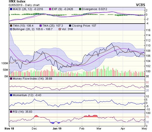 HNX-Index có một diễn biến tương tự. Chỉ số cũng đang cho tín hiệu nhiễu và chưa rõ ràng về mặt xu hướng ngắn hạn, khi chỉ số liên tục giao cắt với MA20 và các đường MA quan trọng như MA5,10,20 đang hội tụ, cho thấy chỉ số có thể tiếp tục đi ngang giằng co trong biên độ quanh 105,8-107,6 điểm (MA 50 và MA100).