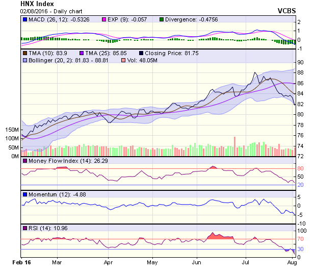 HNX-Index hình thành cây nến đỏ đặc dài, không có bóng nến trên và xuất hiện bóng nến dưới ngắn. Thanh khoản tăng mạnh so với các phiên giao dịch trong 2 tuần trở lại đây. Đường giá cắt xuống dưới MA100. Các chỉ báo kỹ thuật tiếp tục biến động tiêu cực khi RSI và MACD đều đang lần lượt đi xuống dưới đường 30 và đường 0. Vùng hỗ trợ 81 điểm. Vùng kháng cự 83 điểm.