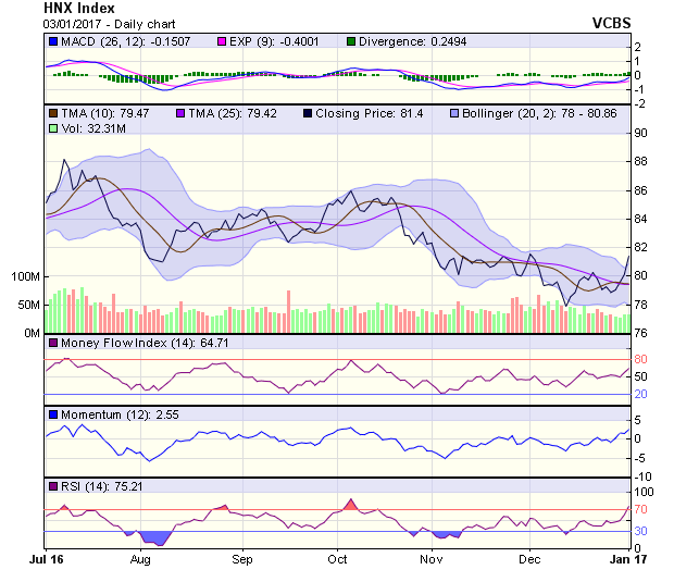 HNX-Index cũng tăng điểm mạnh, nên tín hiệu ngắn hạn là tích cực, với vùng hỗ trợ trong khoảng 79,7-79,8 điểm (MA5-10) và kháng cự tại 81,9 điểm (đỉnh phiên 1/12). Tín hiệu trung hạn là tích cực, với hỗ trợ gần nhất tại 80,5 điểm (MA50). Tuy nhiên, HNX-Index vẫn ở trong thị trường giá xuống, với vùng kháng cự tại 82,3-82,4 điểm (MA100-200). Trong phiên 4/1, nhiều khả năng HNX-Index sẽ tiếp tục tăng điểm để hướng đến kháng cự gần nhất tại 81,9 điểm (đỉnh phiên 1/12). Nếu điều chỉnh xảy ra, mốc hỗ trợ gần nhất của chỉ số tại 80,5 điểm (MA50).