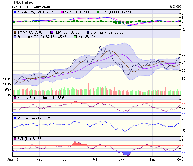 HNX-Index kết phiên với cây nến xanh và bóng trên dài thể hiện lực bán của nhà đầu tư về cuối phiên. ADX đang có xu hướng đi lên thể hiện xu hướng rõ ràng hơn. MACD cho tín hiệu tích cực. Tuy nhiên, Stochastic %K đang đi ngang cho tín hiệu có thể có điều chỉnh trong các phiên tới. Mốc hỗ trợ gần nhất cho chỉ số tại 84,8 điểm. Mốc kháng cự gần nhất là 86 điểm. Do đó, HNX-Index nhiều khả năng tiếp tục tăng điểm trong tuần này, tuy nhiên sẽ có phiên điều chỉnh xen giữa.