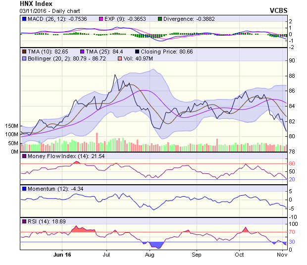 Các chỉ báo kỹ thuật tiếp diễn đà giảm sâu và nhanh, chính thức nằm trong vùng quá bán. Chỉ báo MACD(12,26) cắt xuống dưới mốc 0, xác nhận bước vào xu hướng giảm điểm của thị trường trong những phiên tới đây. Thị trường nằm trong vùng biến động rủi ro và có khả năng tiếp tục tiếp cận các mức hỗ trợ thấp hơn. Giai đoạn biến động bấp bênh kết thúc và xác nhận bởi sự suy giảm rõ ràng của toàn bộ chỉ số thị trường trong phiên 3/11 kèm theo sự gia tăng của giá trị thanh khoản giao dịch.