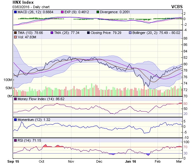 HNX-Index tiếp tục duy trì trên mốc 79 điểm. Áp lực bán không quá mạnh cho thấy tâm lý nhà đầu tư hiện vẫn khá tích cực. Một số chỉ báo như RSI, MACD hiện tiếp tục nằm trong xu thế đi lên. Tiếp tục giữ quan điểm tích cực trong ngắn hạn. Ngưỡng kháng cự tiếp theo nằm ở mốc 80,82 điểm, tương đương MA200.