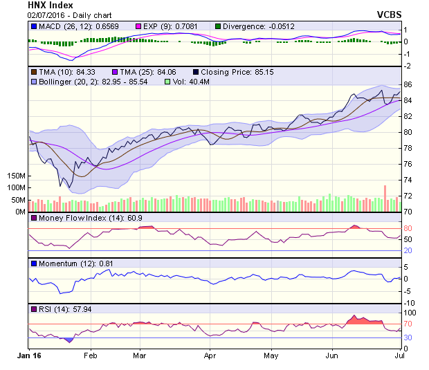 HNX-Index hình thành cây nến xanh rỗng với bóng nến dưới dài ngang thân nến cho thấy, lực cầu tích cực dần về các phiên cuối tuần qua. Đường giá đang bám tại dải bollinger trên. RSI cho tín hiệu vượt lên đường 70, MACD cũng cho tín hiệu tăng về xu hướng. Vùng hỗ trợ 82-83 điểm.