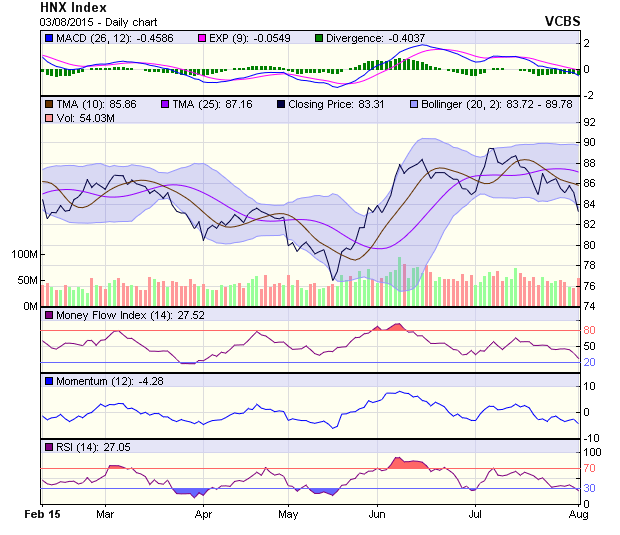 HNX-Index đóng cửa tạo thành một nến đen dài phá vỡ đường neckline của mẫu hình 2 đỉnh tại mốc 85.2 điểm. Như vậy mẫu hình này đã chính thức được xác lập và chỉ số sẽ kiểm định lại mốc 82 để hoàn thiện mẫu hình. Các chỉ báo kỹ thuật vẫn duy trì xu hướng giảm, đường RSI(14) đi xuống khá mạnh, trong khi đường MACD đã cắt đường 0 đi xuống. Các tín hiệu này vẫn đang thể hiện sự điều chỉnh mạnh của đường giá.