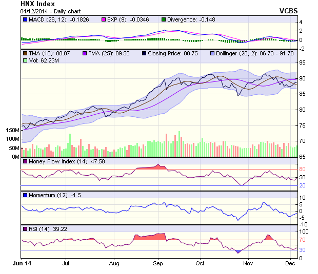 Đà tăng tích cực cũng tiếp diễn trên sàn HNX trong phiên 4/12, chỉ số HNX-Index tăng tới 0,18 điểm lên đứng ở mức 88,75 điểm. Cũng tương tự như VN-Index, chỉ số HNX-Index phiên hôm nay cũng bắt đầu phải chịu áp lực bán ra sau khi tiếp cận mới mốc kháng cự tạo bởi Fibo 38,2% và các MA ngắn hạn. Tuy vậy, độ rộng của thân nến cùng với khối lượng được cải thiện trong phiên hôm nay cho thấy sức cầu vào sàn HNX vẫn đang được duy trì rất tốt. Điều này góp phần củng cố cho kịch bản HNX-Index đang trong giai đoạn hoàn thiện mô hình Ascending Triangle ngắn hạn. Theo kịch bản này, nếu HNX-Index tiếp tục vượt qua tập hợp các MA 15 và 22 ( quanh mốc 89 điểm) thì mục tiêu tiếp theo của xu hướng giá sẽ là vùng đỉnh cũ 91,4 điểm. mốc kháng cự kể trên.