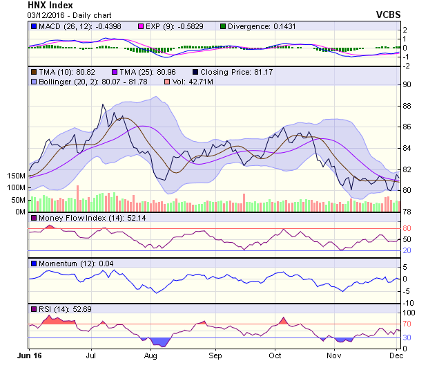 Tín hiệu kỹ thuật phiên 2/12 không có sự thay đổi so với phiên 1/12. VN-Index và VN30 vẫn duy trì tín hiệu kỹ thuật ngắn hạn Tiêu cực, với các ngưỡng kháng cự lần lượt nằm tại 668 và 630 điểm. Các ngưỡng hỗ trợ phía dưới của chỉ số tạo bởi các đường trung bình động trung hạn MA150 và MA200 ngày, lần lượt tại 655 và 625 điểm. Tín hiệu HNX-Index tỏ ra tích cực hơn nhờ tác động từ nhóm dầu khí, tuy nhiên, vẫn chưa thể vượt qua kênh tích lũy, với cản trên tại 81,6 điểm. Dự báo, thị trường vẫn có thể giảm trong tuần này để VN-Index kiểm định lại ngưỡng hỗ trợ tại 655 điểm.