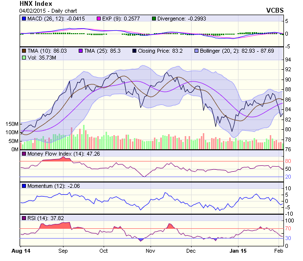 Đồ thị HNX-Index hồi phục tiến sát lại đường SMA200, bật lên ngay trên mốc hỗ trợ 82.7 điểm. Đây là dấu hiệu tích cực cho thấy xu hướng giảm điểm đã chững lại. Tuy vậy xu hướng trung và dài hạn chưa được khẳng định do chỉ số này đã phá vỡ hầu hết các đường SMA. Các chỉ báo kỹ thuật tiếp tục cho tín hiệu xấu. Stochastic tiếp tục lao dốc. Đường tín hiệu của MACD tiếp tục giảm về mốc 0.