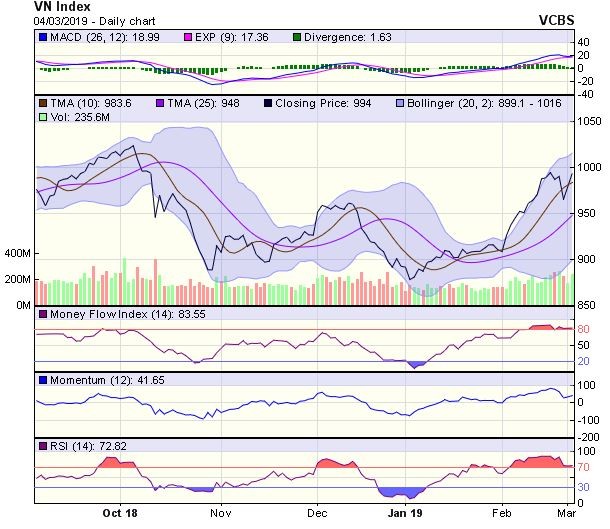 Chỉ số nhiều khả năng sẽ tiếp cận lại vùng kháng cự quanh 1.000 điểm trong một vài phiên kế tiếp.