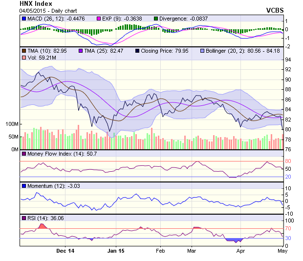 Đường trendline phía trên tỏ ra khá vững chắc và HNX-Index phản ứng khá tiêu cực khi liên tiếp test không thành công đường này và giảm mạnh về mốc 80 điểm. Mốc 78 điểm sẽ là mốc hỗ trợ tiếp theo của chỉ số này trong các phiên sắp tới. Các chỉ báo kỹ thuật đều cho tín hiệu tiêu cực khi đường Stochastic suy giảm mạnh từ vùng quá bán, đường RSI cũng đang giảm mạnh về dưới mốc 30.