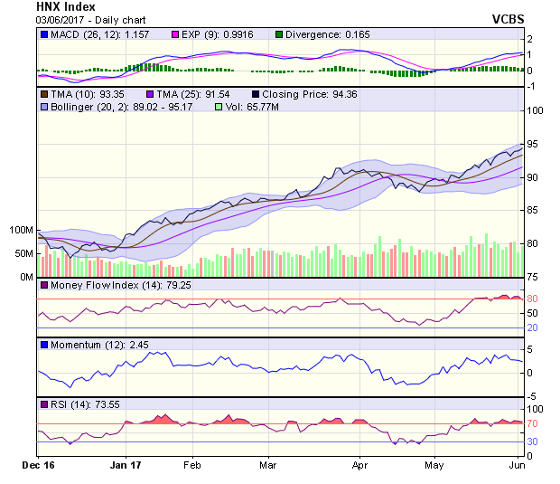 Dự báo, trong tuần giao dịch này, xu hướng chính của HNX-Index sẽ vẫn tăng điểm để thử thách lại ngưỡng kháng cự tương ứng với vùng đỉnh ngắn hạn tại 94,7 điểm. Trong phiên 5/6, HNX-Index nhiều khả năng duy trì đà tăng, với kháng cự và hỗ trợ lần lượt tại 94,7 điểm và 93,4-93,9 điểm.