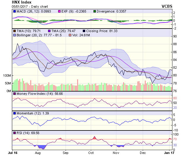 Tuy nhiên, chỉ số vẫn ở trong thị trường giá xuống (bear market), với kháng cự tại 82,2 điểm (MA100). Trong phiên 6/1, HNX-Index có thể tiếp tục giảm điểm về mốc hỗ trợ gần nhất tại 80,8 điểm (MA5), nếu mốc này được giữ vững, chỉ số sẽ hồi phục từ đây để hướng đến kháng cự gần nhất tại 82,2 điểm (MA100).
