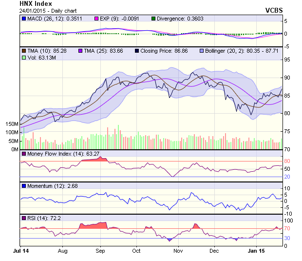 Đường giá HNX-Index cho tín hiệu tích cực với 1 Whitecandlestick được tạo thành bật khỏi nền sideway trước đó. Tuy vậy, chỉ số này đang gặp vấn đề tại mốc cản 87 điểm tạo ra bởi đường SMA100. Cần thoát hẳn khỏi ngưỡng cản này mới khẳng định xu thế tăng điểm của HNX-Index trong thời gian tới.Các chỉ báo kỹ thuật vẫn cho tín hiệu tích cực.