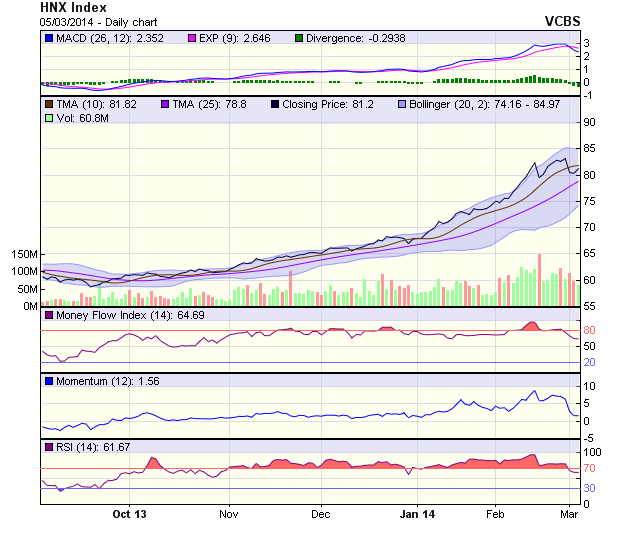 Ngắn hạn, sau một sóng tăng điểm mạnh, HN-Index đang gặp cản tại vùng điểm 83-85.