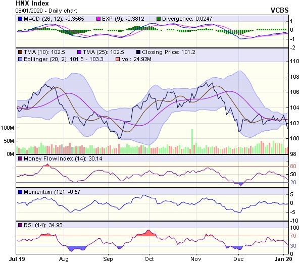 HNX-Index có diễn biến tiêu cực hơn. Chỉ số có phiên giảm điểm đóng cửa thứ hai liên tiếp dưới MA20, kèm khối lượng gia tăng, cho thấy chỉ số có thể chịu áp lực điều chỉnh về vùng hỗ trợ tâm lý 100 điểm trong những phiên tới.