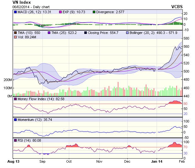 Xu hướng của đường giá tiếp tục là tăng. Dù vậy sau một tháng đầu năm 2014 liên tiếp đi lên mạnh mẽ, khả năng VN-Index bước vào pha điều chỉnh ngắn hạn đang hiện hữu.