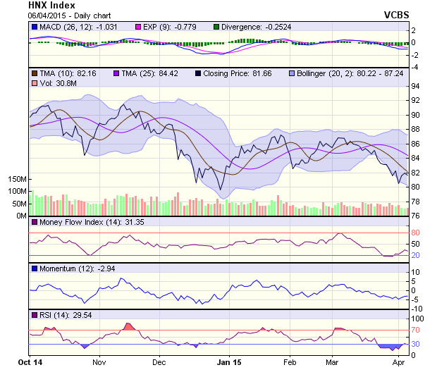Đồ thị chỉ số HNX-Index tạo thành 1 spinning top với thân nến ngắn cho thấy cung cầu trong ngắn hạn đang cùng trong trạng thái thận trọng. Nhiều khả năng HNX-Index sẽ test lại mốc hỗ trợ 80 điểm trong các phiên sắp tới. Đường Stochastic cũng đang trong xu hướng hồi phục tích cực trở lại. Đường RSI có xu hướng suy yếu lại so với phiên trước.