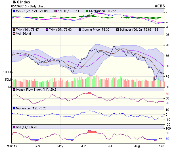 Đồ thị tuần HNX-Index cho thấy mô hình đảo chiều của mẫu hình hammer tuần trước không hoàn thành. Chỉ số tạo thành mẫu hình engulfing giảm điểm cho thấy áp lực bán đã quay trở lại. Các chỉ báo kỹ thuật cũng cho tín hiệu thiếu tích cực. Đồ thị ngày sau phiên giảm điểm rất mạnh đầu tuần liên tục tạo thành các Doji nằm trên vùng hỗ trợ 76–76.5 điểm.