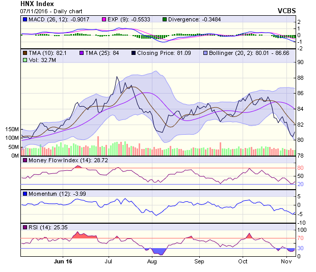 HNX-Index tăng điểm khá tốt và kết phiên với cây nến xanh dài khá gần MA5. Chỉ số đóng cửa dưới MA5 và MA 10 nên tín hiệu trong ngắn hạn vẫn là tiêu cực, với ngưỡng kháng cự tại 81,2 điểm (MA5). Xu hướng trong trung hạn tiếp tục là tiêu cực, với vùng kháng cự trong khoảng 83,3-84 điểm (MA20-50-100). HNX-Index kết phiên dưới MA200 nên trong dài hạn, xu hướng của thị trường là không tích cực với kháng cự gần nhất tại 82 điểm (MA200). Dự đoán xu hướng trong phiên 8/11, HNX-Index có thể tăng điểm nhẹ để thử thách lại mốc kháng cự ngắn hạn tại 81,2 điểm.