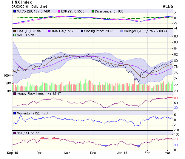 HNX-Index có lúc bứt phá khỏi mốc 80 điểm trong phiên, tuy nhiên vẫn kết phiên dưới mốc này khi chịu áp lực bán từ nhiều nhà đầu tư. Rủi ro điều chỉnh có thể xảy ra trong phiên tới khi mà chỉ số đang trên đường tiệm cận ngưỡng kháng cự trên 80,82 điểm, tương đương MA200. Nếu như lực cung từ nhà đầu tư ngắn hạn được hấp thụ tốt trong 1 vài phiên tới, quan điểm tích cực trong ngắn hạn đối với chỉ số được duy trì.