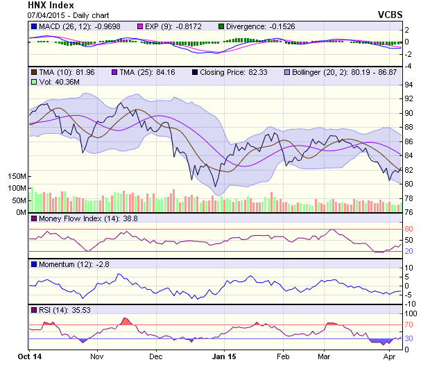 Đồ thị chỉ số HNX-Index bật tăng tạo thành 1 white candlestic khá dài cho thấy lực tăng đang xuất hiện mạnh trở lại. Tuy vậy, chỉ số này cần bật khỏi neckline 82.7 điểm của mô hình 2 đỉnh trước đó nới có thể khẳng định xu thế hồi phục chính thức quay trở lại. Các đường chỉ báo kỹ thuật đều trong trang thái tích cực. Đường stochastic hồi phục tăng mạnh mẽ vượt mốc 20, trong khi đường RSI cũng đang trong xu hướng tăng trở lại.