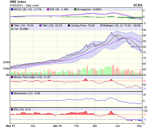 Ngắn hạn, HNX-Index đã rơi qua vào vùng hỗ trợ ngắn hạn 79-80 và chính thức bắt đầu hình thành kênh giảm điểm ngắn hạn với đỉnh sau thấp hơn đỉnh trước, đáy sau thấp hơn đáy trước. Chỉ số đang nằm ngay dưới ngưỡng hỗ trợ SMA 100 và không có ngưỡng hỗ trợ cụ thể nào bên dưới.