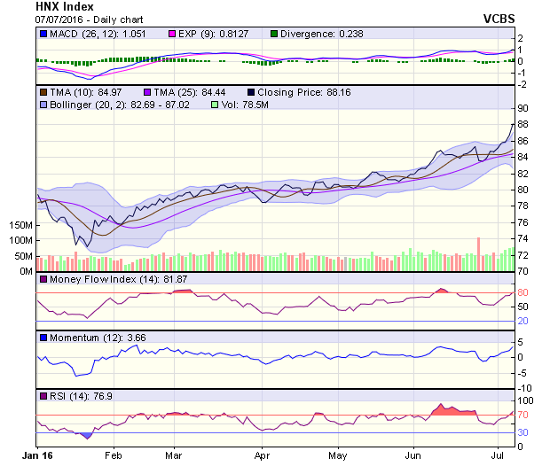HNX-Index hình thành cây nến xanh marubozu, vượt kháng cự 87 điểm cho thấy, lực cầu vào mạnh và đều. Thanh khoản duy trì ở mức cao. RSI vượt lên trên đường 70, đi vào vùng overbought. MACD cho tín hiệu đi lên tích cực trên đường 0. Vùng hỗ trợ 85 điểm. Vùng kháng cự 89 điểm.
