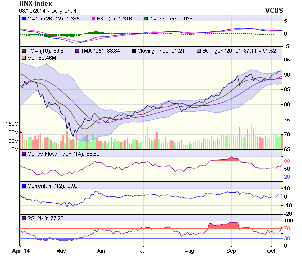HNX-Index giảm điểm nhẹ cuối phiên do nhiều mã thị giá lớn điều chỉnh cuối phiên như PVS, KLS, VCG... Đồ thị chỉ số này tạo thành 1 Doji sau hàng loạt các phiên tăng điểm tốt cho thấy xu hướng tăng đã chậm lại và tâm lý thận trọng đã quay trở lại. Lượng giao dịch khớp lệnh đạt trên 82 triệu đơn vị, tăng nhẹ so với phiên giao dịch trước. Đường MACD cắt lên trên đường tín hiệu.