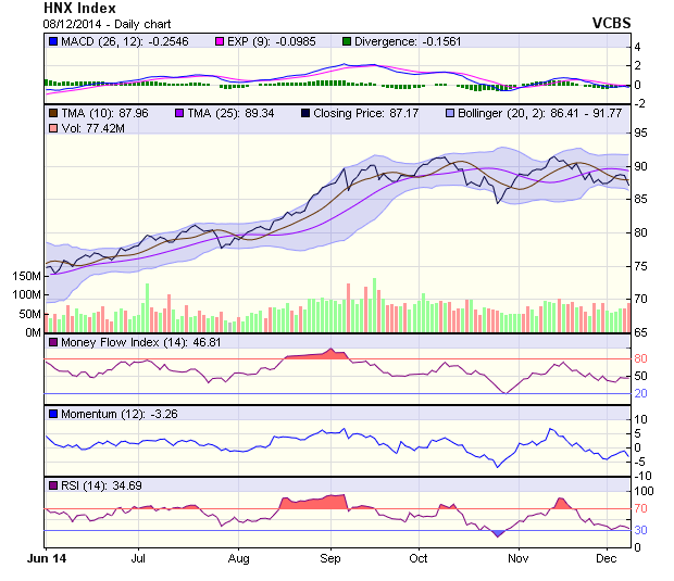 Đồ thị HNX-Index này tạo thành một Black Candlestick khá dài, lùi về dưới trend tăng điểm trung hạn. Nếu chỉ số này tiếp tục điều chỉnh giảm điểm trong phiên giao dịch tới, xu hướng tăng điểm trung hạn tạm thời sẽ bị chấm dứt. Các chỉ báo kỹ thuật như Stochastic và RSI giảm điểm trở lại sau giai đoạn ngắn hồi phục vừa qua.