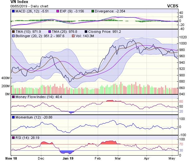 VN-Index giảm 0,66% xuống 951,22 điểm. Thị trường giảm điểm ngay từ đầu phiên và áp lực giảm điểm được duy trì trong toàn bộ thời gian còn lại của phiên giao dịch hôm nay.