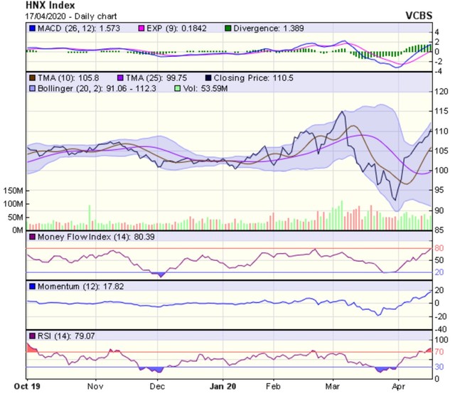 HNX-Index có phiên tăng điểm vượt ngưỡng tâm lý 110 điểm và duy trì đóng cửa trên hầu hết các đường MA quan trọng từ MA5 tới MA200, cho thấy xu hướng phục hồi đang tiếp diễn, chỉ số có thể tiếp tục hướng lên thử thách ngưỡng kháng cự 115 điểm.