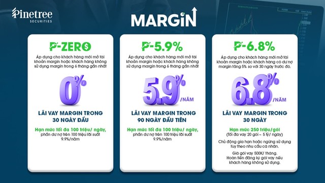 Cùng lúc, một công ty chứng khoán ngoại vốn được biết đến với các chính sách phí thấp trên thị trường cũng gia nhập “cuộc đua”. Pinetree tung thêm nhiều gói margin linh hoạt, thấp cạnh tranh. Trong đó, phải kể đến chính sách ưu đãi P-Zero - miễn lãi vay margin lên tới 30 ngày với khách hàng margin mới. Theo đó, nhà đầu tư mở mới tài khoản margin (áp dụng cả khách hàng mới và khách hàng hiện tại chưa có tài khoản margin) và nhà đầu tư hiện tại chưa phát sinh dư nợ margin trong vòng 6 tháng sẽ không phải trả lãi trong thời hạn 30 ngày kể từ ngày giải ngân thành công. Từ ngày thứ 31 trở đi, mức phí margin áp dụng cố định 9.9%/ năm.