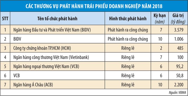 Danh sách các ngân hàng thành công trong huy động vốn qua phát hành trái phiếu thời gian qua còn nối dài với những cái tên như: Ngân hàng Á Châu (ACB - HNX), Ngân hàng Công thương Việt Nam (CTG - HOSE)… Bên cạnh các ngân hàng, nhiều doanh nghiệp niêm yết, công ty chứng khoán lớn như: Vingroup (VIC - HOSE), Công ty Chứng khoán Sài Gòn (SSI - HOSE), Công ty Chứng khoán TP.HCM (HCM - HOSE)… cũng là những doanh nghiệp huy động vốn thành công qua kênh trái phiếu.