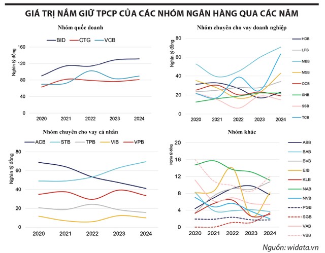 Nhóm ngân hàng chuyên cho vay doanh nghiệp có mức gia tăng đầu tư TPCP trong năm 2024, với mức tăng trưởng hơn 40%, trong khi các nhóm ngân hàng khác đều duy trì ở mức không đổi. Xét về mức tương đối thì tỷ trọng phần trăm nắm giữ TPCP của nhóm các ngân hàng sụt giảm đáng kể trong những năm qua. Điều này có thể được giải thích bởi xu hướng lãi suất duy trì ở mức thấp trong hai năm qua.