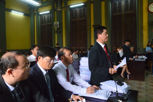 Đại diện nguyên đơn (ông Trương Đình Quý, đứng gần) và bị đơn (ông Mã Bửu Thịnh, đứng xa) đang trình bày trước phần hỏi của HĐXX