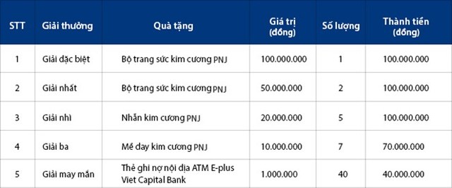 Theo đó, khi khách hàng cá nhân gửi tiết kiệm trong khoảng thời gian khuyến mại với mức tiền gửi tối thiểu chỉ từ 3 triệu đồng, khách hàng sẽ nhận được một mã số dự thưởng và có trong tay cơ hội tham gia quay số trúng những phần thưởng giá trị. Chương trình áp dụng cho các giao dịch gửi tiền kiệm có kỳ hạn từ 1 đến13 tháng, lãnh lãi cuối kỳ. Số lượng số dự thưởng được cấp phát ngẫu nhiên theo bội số của số tiền gửi tương ứng trên sổ tiết kiệm.