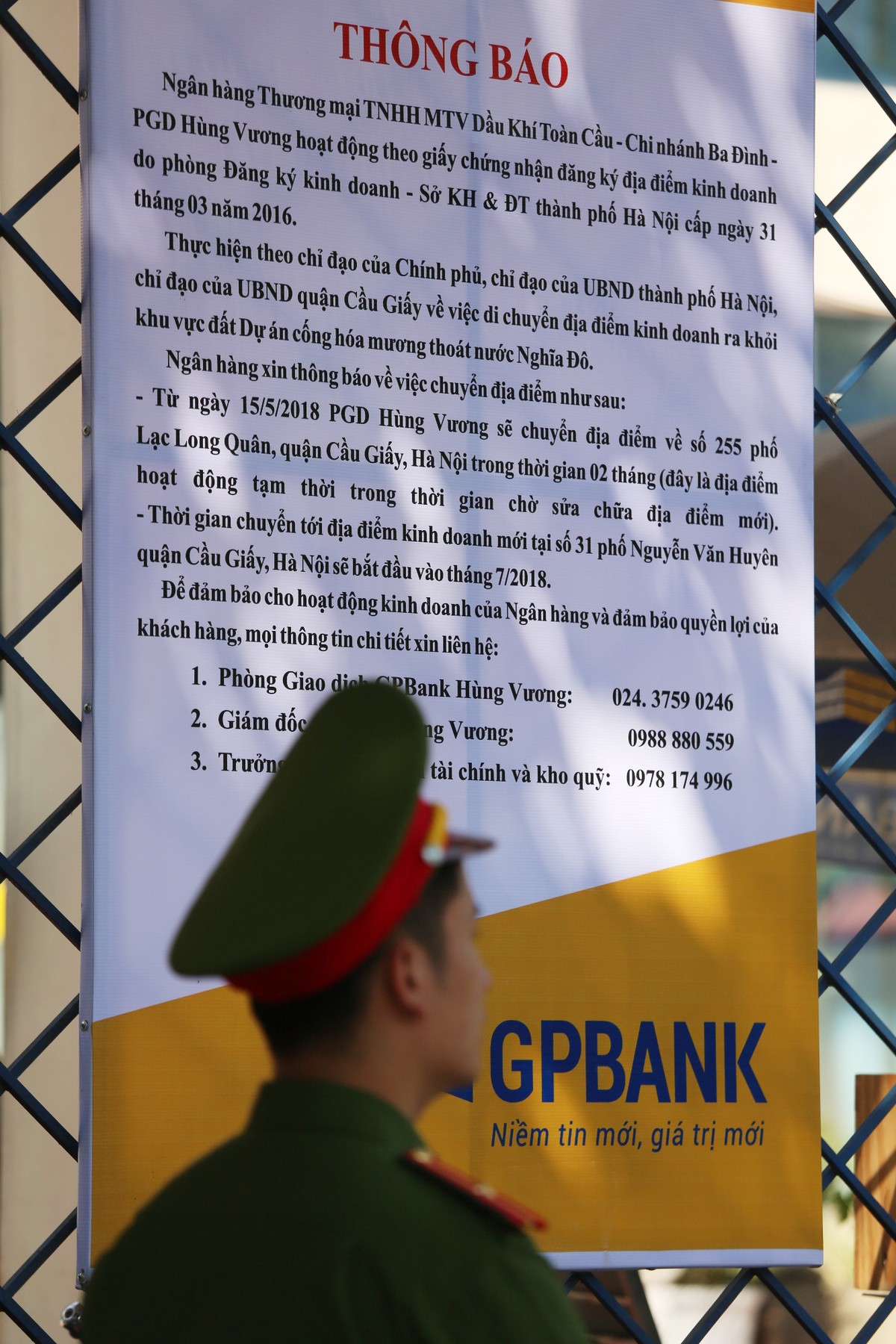 Thông báo của một ngân hàng trên đường Nguyễn Khánh Toàn ghi rõ việc thực hiện theo chỉ đạo của Chính phủ về việc di chuyển địa điểm kinh doanh ra khỏi dự án cống hóa Mương thoát nước Nghĩa Đô.