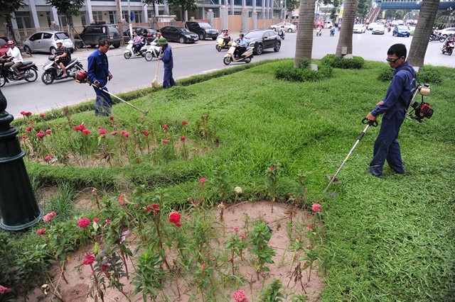 Bắt đầu từ 9/10, công nhân của Công ty cây xanh Hà Nội đã tiến hành cắt cỏ trên nhiều tuyến phố lớn