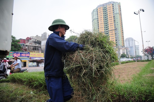 Công nhân dọn cỏ trên đường đại lộ Thăng Long