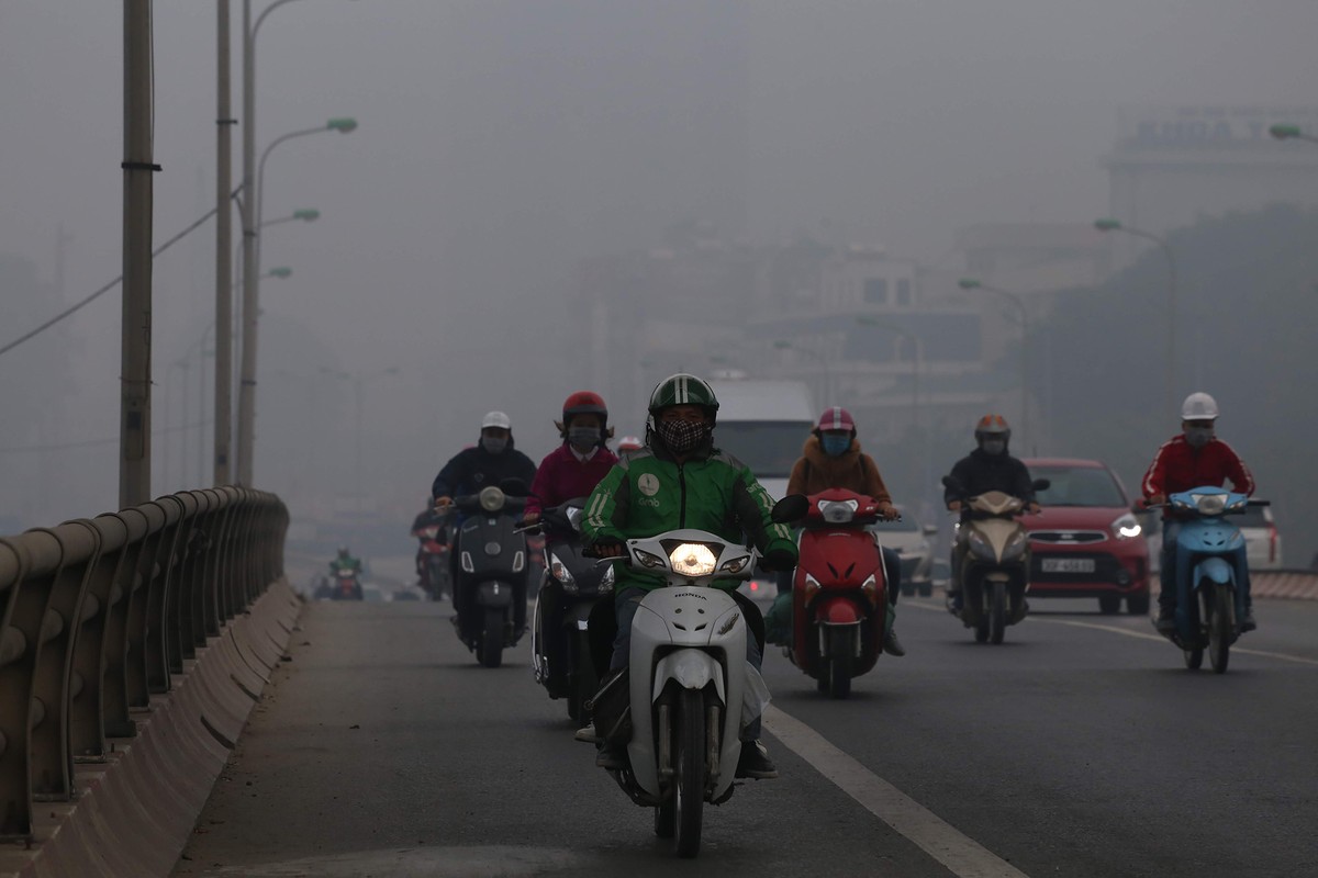 Cầu Nhật Tân phủ kín trong lớp sương mù dày đặc.