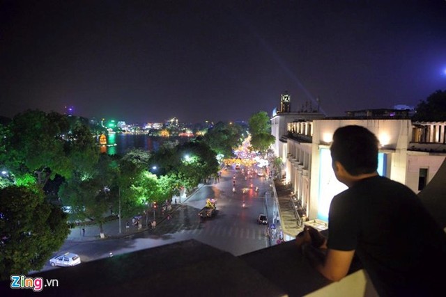 Góc quan sát tuyệt đẹp từ tầng 5 Tràng Tiền Plaza. Từ vị trí này, người xem có thể nhìn thẳng ra điểm bắn pháo hoa tầm cao ở Bưu điện thành phố ngay trước mặt. Tuy nhiên, để có chỗ, khách phải dùng bữa sang trọng và đắt tiền.
