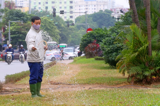 Trong thời gian đường được mở rộng, nhân viên Công ty Cây xanh Hà Nội tiếp tục chăm sóc phần cây cỏ còn lại.