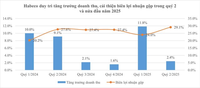 Trong riêng quý II/2025, lợi nhuận gộp hợp nhất của Habeco thu về 694,5 tỷ đồng, biên lợi nhuận gộp đạt 29,1%, ghi nhận mức biên lợi nhuận gộp theo quý cao nhất nhiều năm trở lại đây. Lợi nhuận gộp lũy kế 6 tháng đạt 1.048,6 tỷ đồng, tăng trưởng 15,2% so với quý 2/2024. Biên lợi nhuận gộp nửa đầu năm đạt 27,2%, tăng mạnh so với mức 24,9% cùng kỳ năm 2024.