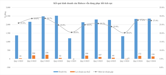 Kết thúc quý 3/2024, Tổng công ty Bia-Rượu-Nước giải khát Hà Nội (Habeco) báo cáo doanh thu hợp nhất đạt 2.348,2 tỷ đồng, tăng 2,1% so với cùng kỳ năm 2023 và nối dài chuỗi tăng trưởng doanh thu sang quý thứ 3 liên tiếp. Đây là kết quả tích cực cho thấy thị phần tiêu thụ của Tổng công ty đang được cải thiện trong bối cảnh tình hình chung của ngành còn nhiều khó khăn. Đặc biệt, cơn bão Yagi vừa tàn phá nặng nề khu vực thị trường trọng điểm là các tỉnh phía Bắc trong trung tuần tháng 9/2024 và ảnh hưởng lớn đến hoạt động phân phối, bán hàng của Tổng công ty.