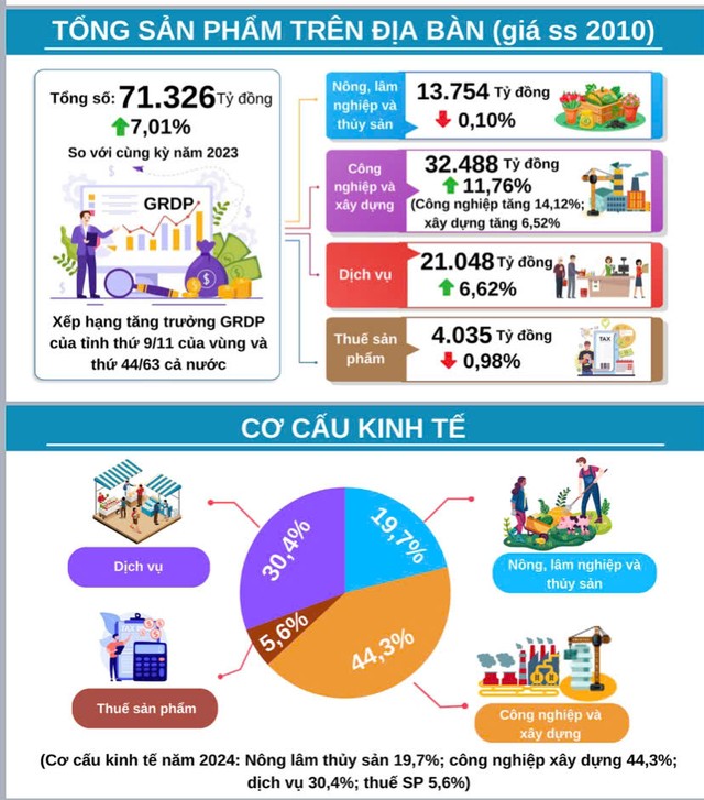 GRDP toàn tỉnh đạt trên 71.300 tỷ đồng, tăng 7,01% so với năm trước, khẳng định sự nỗ lực của cả hệ thống chính trị, cộng đồng doanh nghiệp và nhân dân. Quy mô kinh tế đạt hơn 132.700 tỷ đồng, đưa Thái Bình lên vị trí thứ 23 toàn quốc và đứng thứ 8 khu vực Đồng bằng sông Hồng. Cơ cấu kinh tế tiếp tục chuyển dịch tích cực, với tỷ trọng công nghiệp - xây dựng chiếm 44,3%, dịch vụ 30,41%, và nông, lâm nghiệp, thủy sản 19,7%.