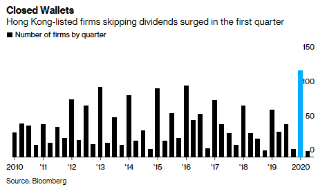 Theo dữ liệu từ Bloomberg, có tới 126 công ty niêm yết ở Hồng Kông đã quyết định không chia trả cổ tức trong quý I/2020, đây là con số cao nhất kể từ năm 1985. Trong đó, có khoảng một nửa các công ty trong số đó có trụ sở tại Trung Quốc và ít nhất 60% trong số đó xem Trung Quốc là thị trường tiêu thụ hàng lớn nhất.
