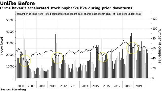 Các công ty đang giữ lại lợi nhuận thay vì phân phối lại cho cổ đông. Theo đó, công ty chia trả cổ tức nhiều nhất trong vòng 35 năm qua tại Hồng Kông cũng đã dừng việc chia cổ tức trong quý I vừa qua. Trong khi định giá cổ phiếu nhiều công ty gần đây đã mở mức thấp lịch sử, các công ty đã không thực hiện mua lại cổ phiếu quỹ. Bên cạnh đó, việc bán các quyển mua cổ phiếu cũng gần chạm mức đỉnh cao nhất kể từ 2018.